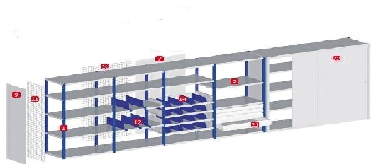 Mit Stirnwand und Seitenwand kann ein Bereich abgegrenzt werden. Auch eine Abgrenzung durch Gitterwand ist möglich. Werden Fachbodenregale zusammen gestellt, kann eine Durchschubsicherung durch eine Rück- oder Mittenwand eingebaut werden. Auch diese ist in Gitterausführung mglich.