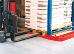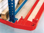 Reinforced corner guide for angle or U-shape guiderails. Facilitates safe entry for forklifts into the aisle.
